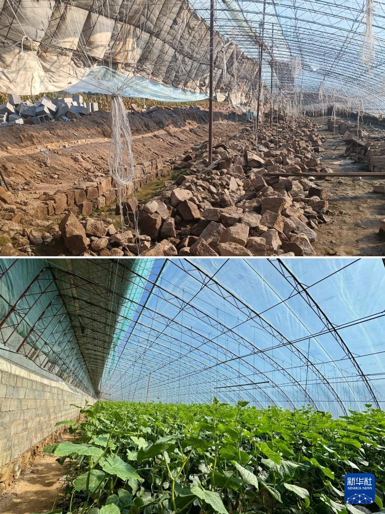拼版照片:上圖為2024年8月30日在遼寧省葫蘆島市綏中縣拍攝的被洪水沖毀的黃瓜大棚(新華社發);下圖為2025年3月6日在綏中縣拍攝的災后重新修建的黃瓜大棚(新華社記者 吳青昊 攝)。