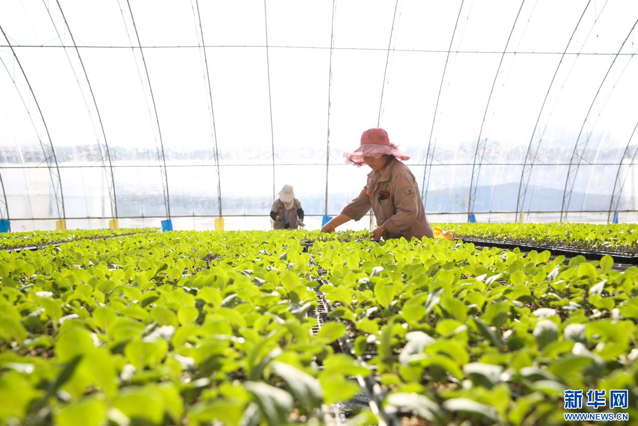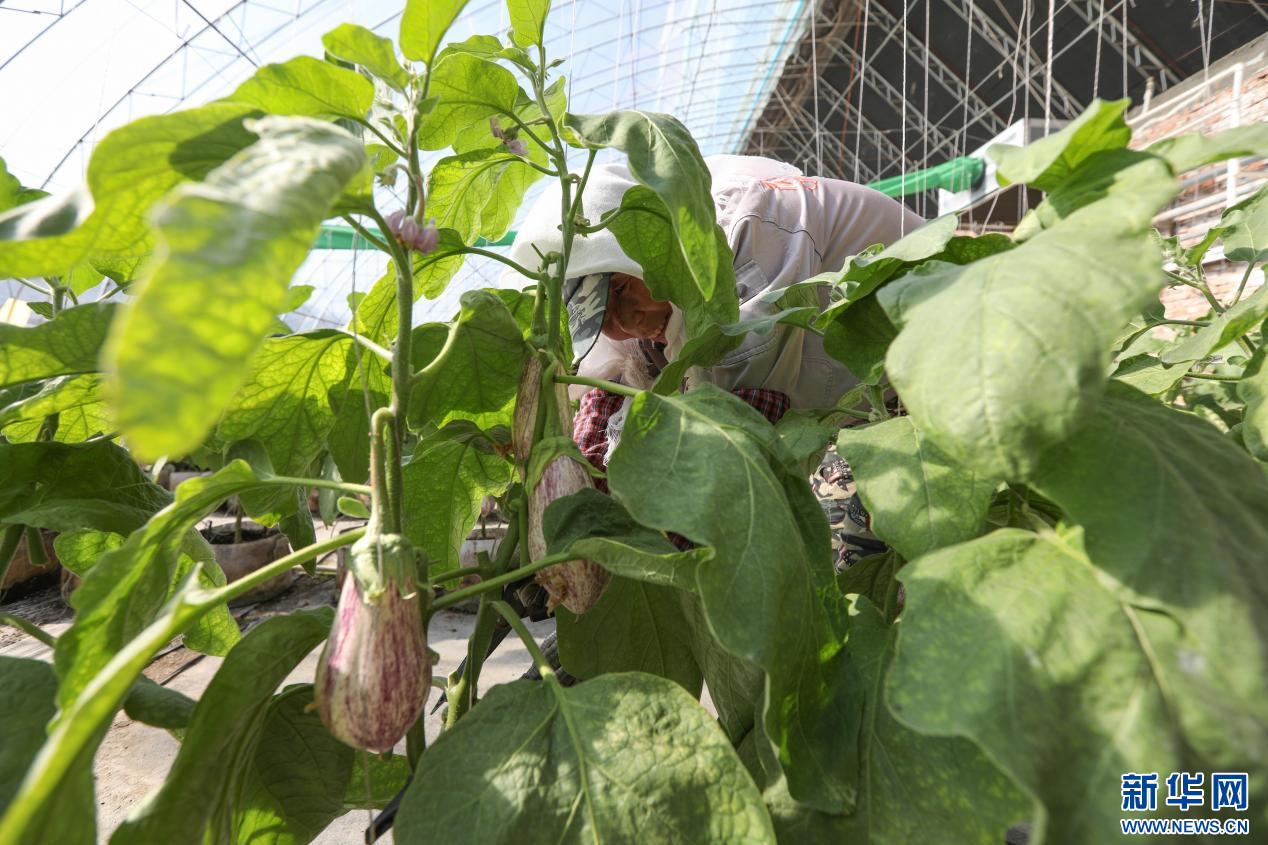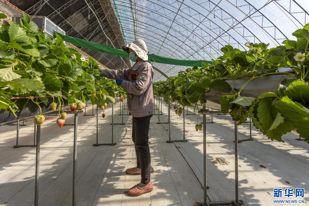 圖為工人在秋實農科草莓大棚里修剪枝葉