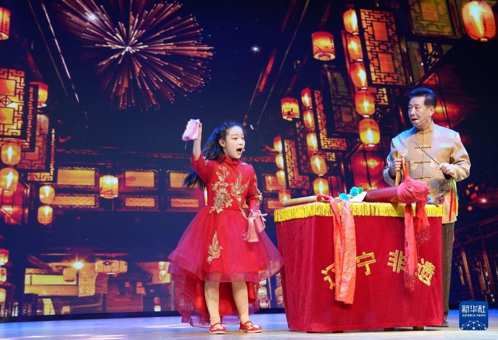 3月26日,8歲的金書瑤(左)和師父趙國祝一起表演快板書《長安街上逛花燈》。新華社記者 吳青昊 攝