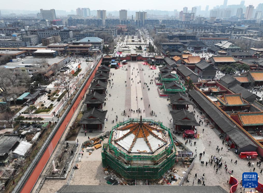 這是4月6日拍攝的保養維護中的沈陽故宮大政殿(無人機照片)。