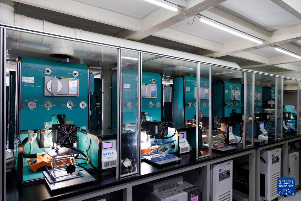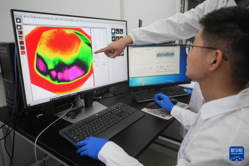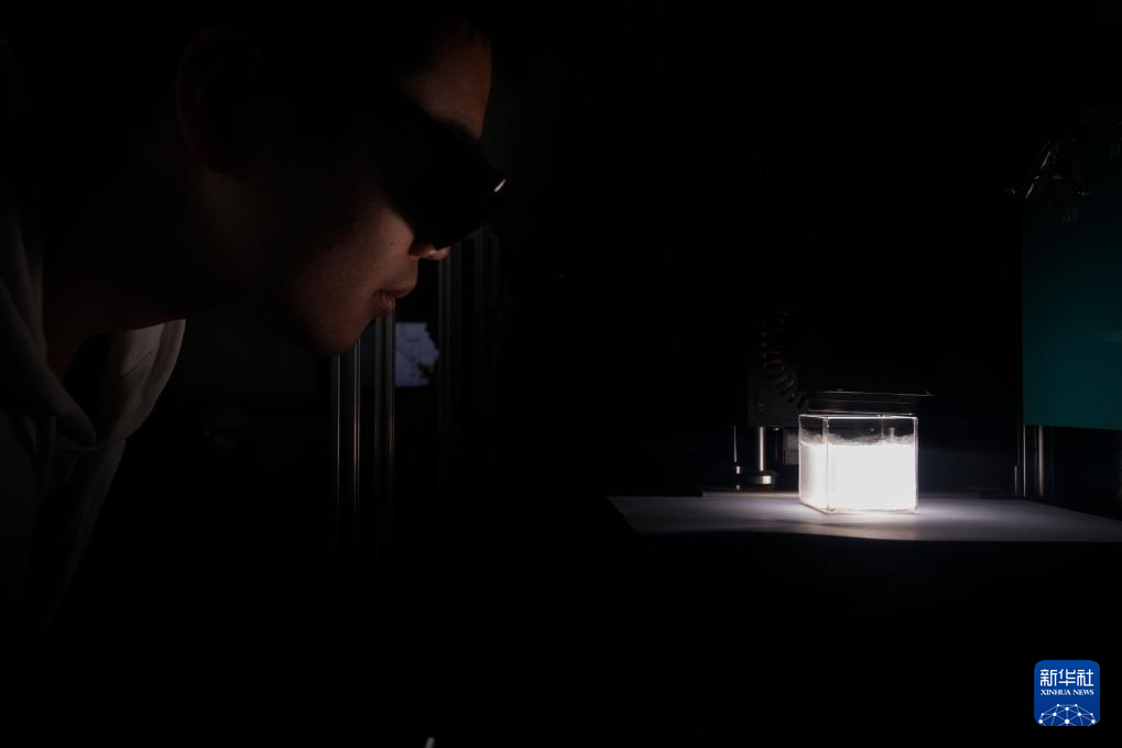 4月3日,在中國科學院金屬研究所沈陽材料科學國家研究中心實驗室,科研人員在觀察光催化分解水制氫的實驗進展。