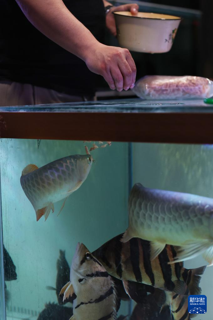 4月10日,在鞍山三臺子觀賞魚交易中心,一名店主在喂魚。