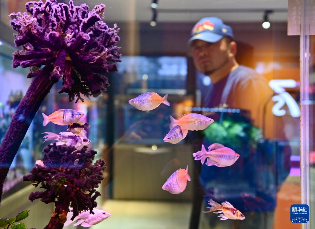 4月10日,在鞍山三臺子觀賞魚交易中心,一名店主在布置魚缸。