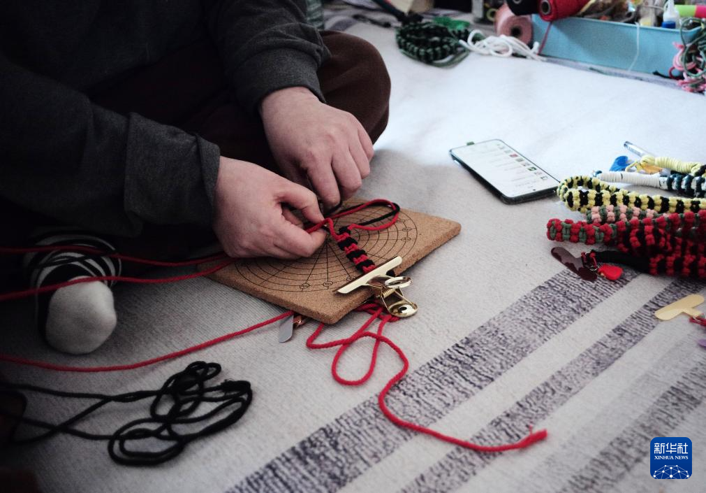 4月7日,楊姐在家中制作手機鏈。
