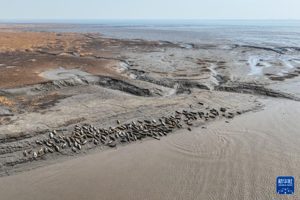 2024年4月9日,西太平洋斑海豹在遼寧盤錦三道溝海域的灘涂上休息(無人機照片)。新華社記者 潘昱龍 攝