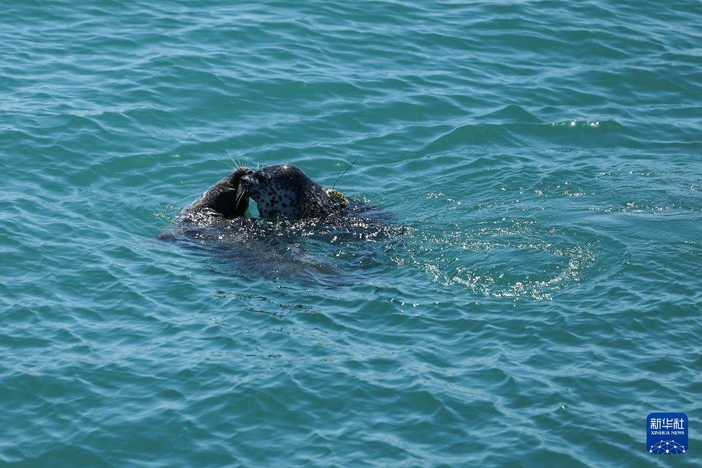 2024年4月16日,被放歸的西太平洋斑海豹在遼寧大連市旅順口區附近海域活動,一只斑海豹身上的信標露出水面。新華社記者 潘昱龍 攝