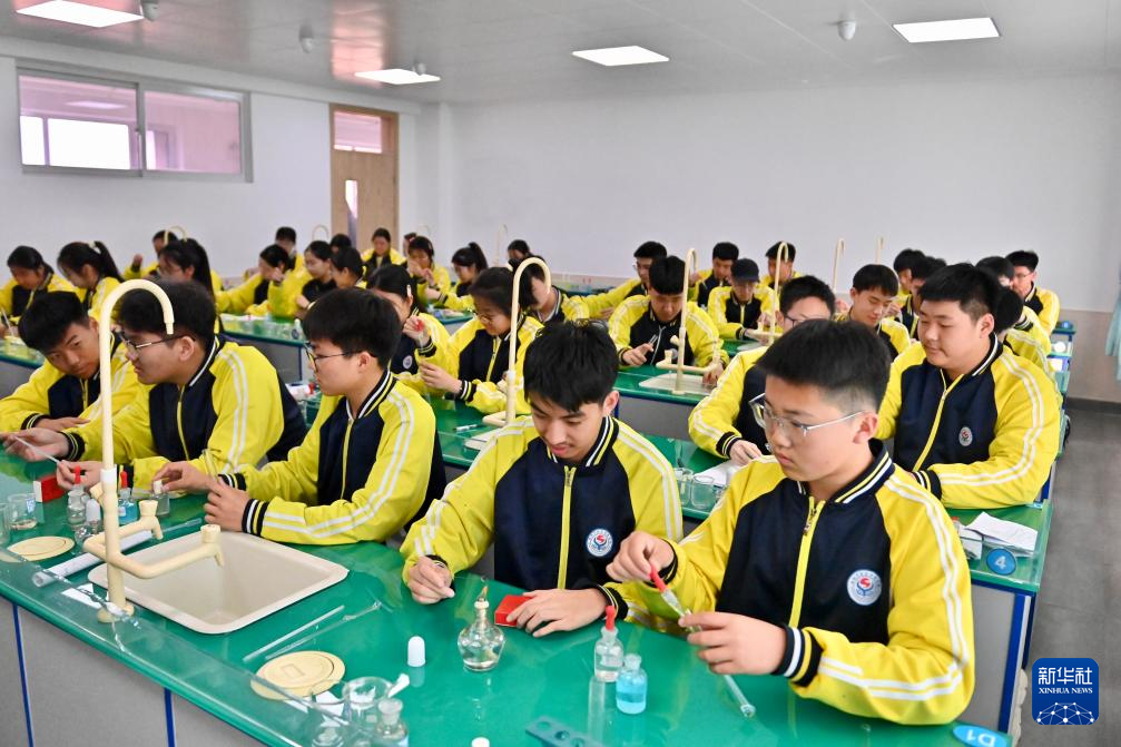 4月15日,海城開發區實驗學校學生在化學實驗室內做實驗。