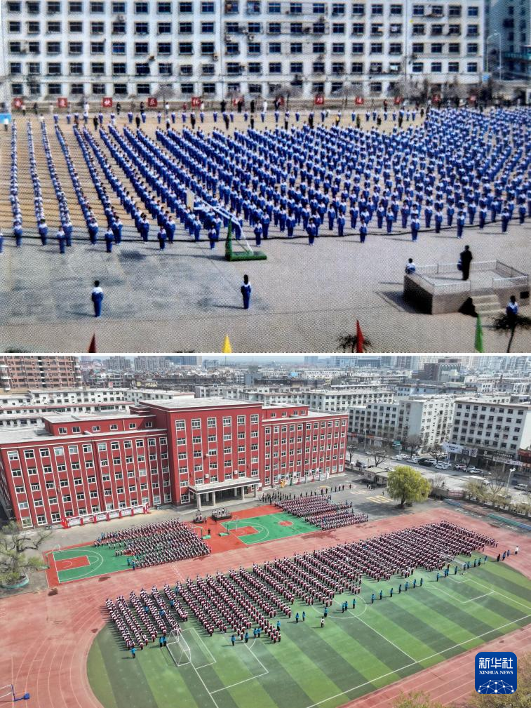 拼版照片:上圖為2007年,海城市西關小學的學生在操場上出早操(資料照片);下圖為2025年4月15日,海城市西關小學的學生在操場上出早操(無人機照片)。