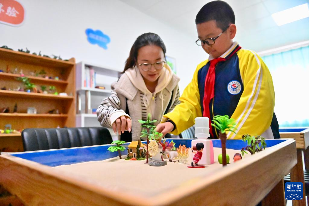 4月15日,海城開發區實驗學校學生在新建成的資源教室內體驗沙盤游戲。