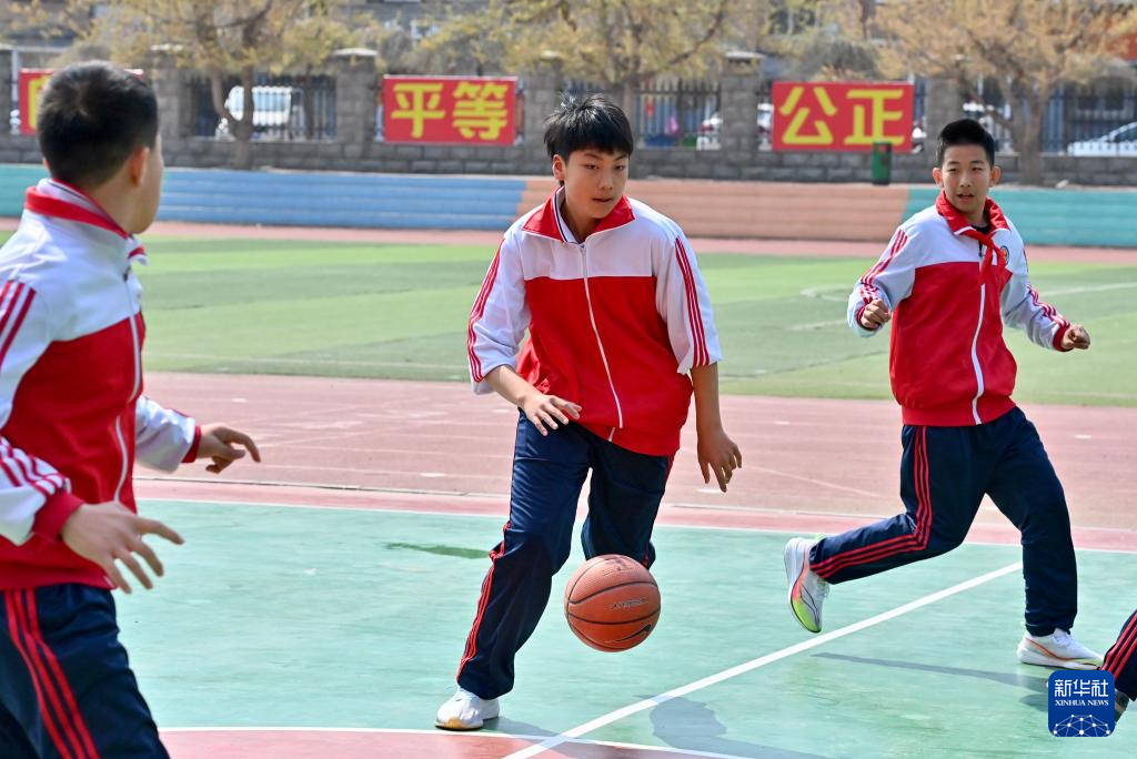 4月15日,海城市西關小學學生在新改造的籃球場上打籃球。