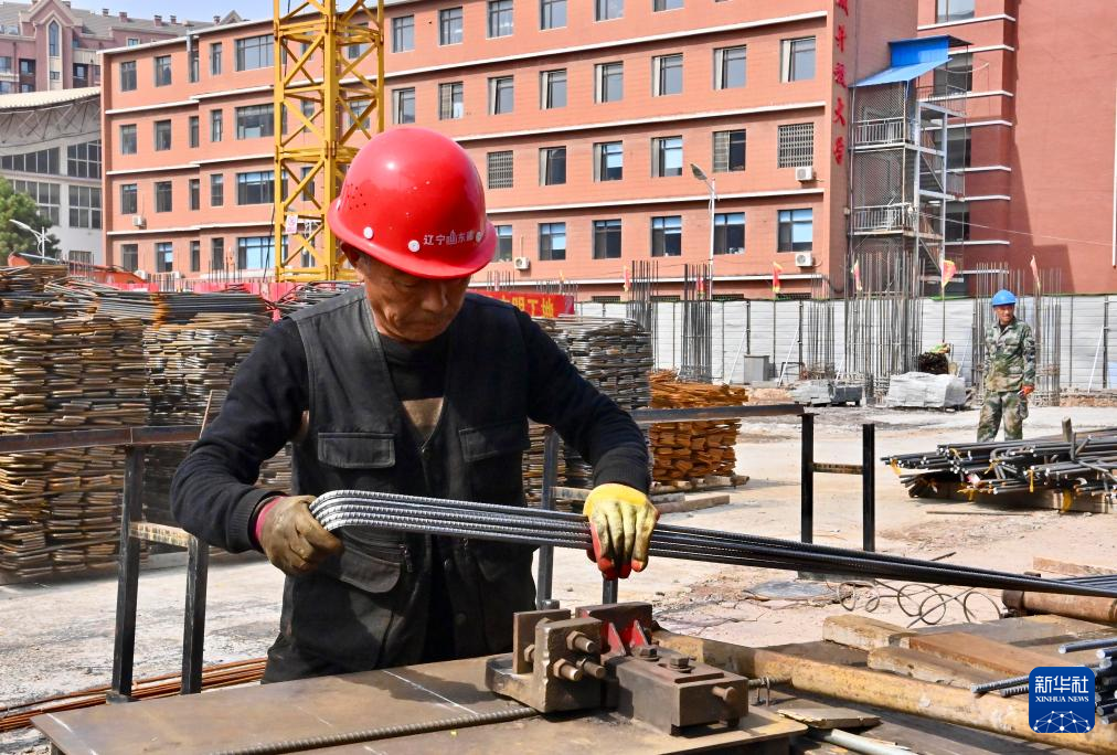 4月16日,工人在海城市后英實驗學校小學部教學樓拆除重建項目現場施工。