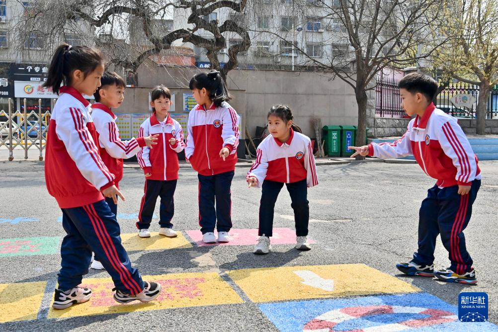 4月15日,海城市西關小學學生在新建成的校園游戲區內玩跳格子游戲。