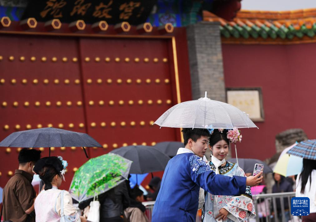 2025年5月3日,游客在沈陽故宮門前打卡拍照。