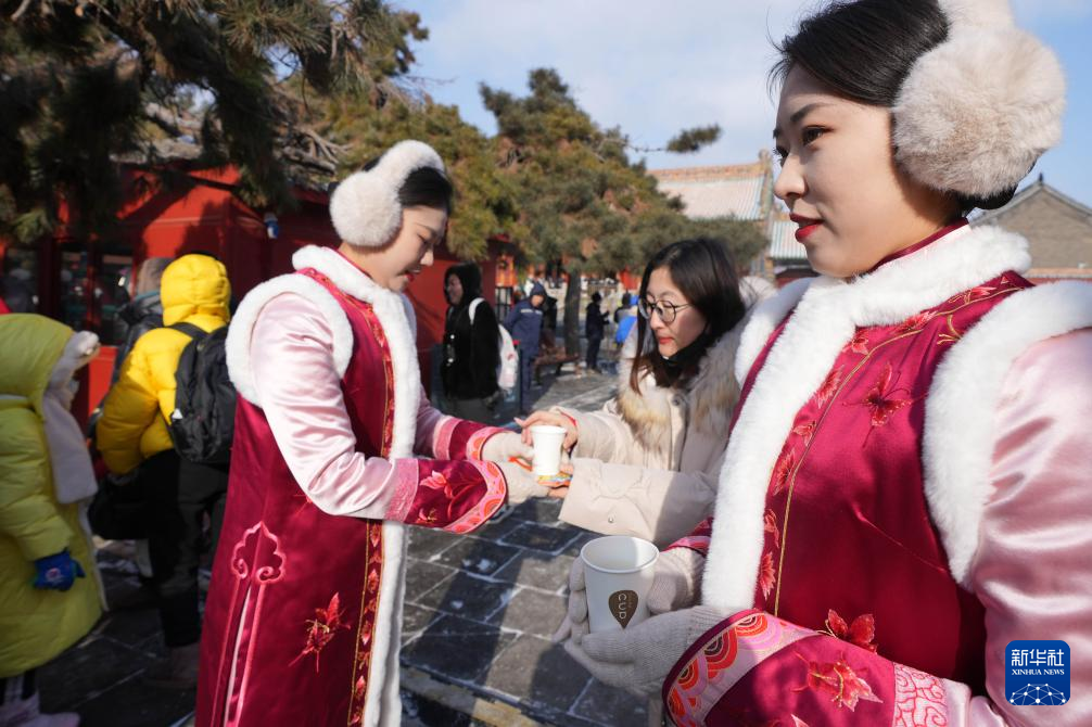 2024年1月21日,沈陽故宮工作人員為游客提供姜糖水和暖貼。