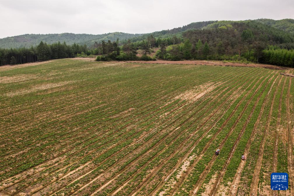 5月14日,在遼寧省撫順市新賓滿族自治縣,一家生產遼細辛企業的工作人員在種植基地進行日常維護工作(無人機照片)。