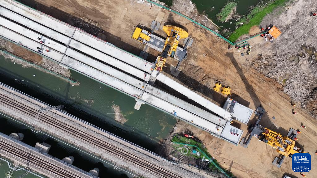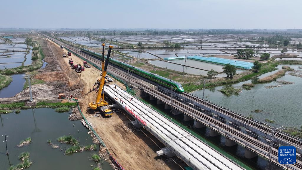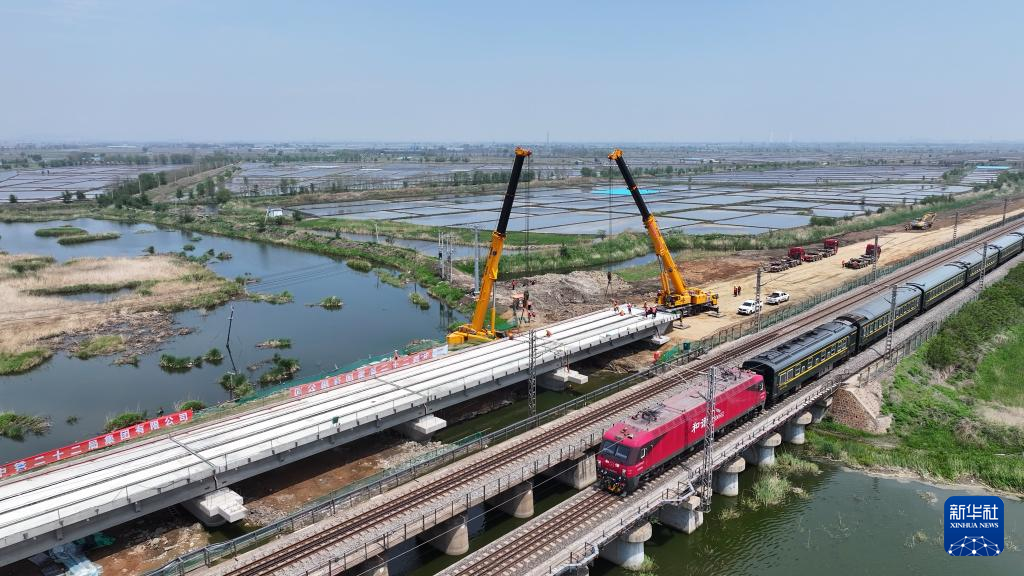 這是5月19日拍攝的沈山鐵路鴨子河中橋新建大橋架梁工程施工現場(無人機照片)。