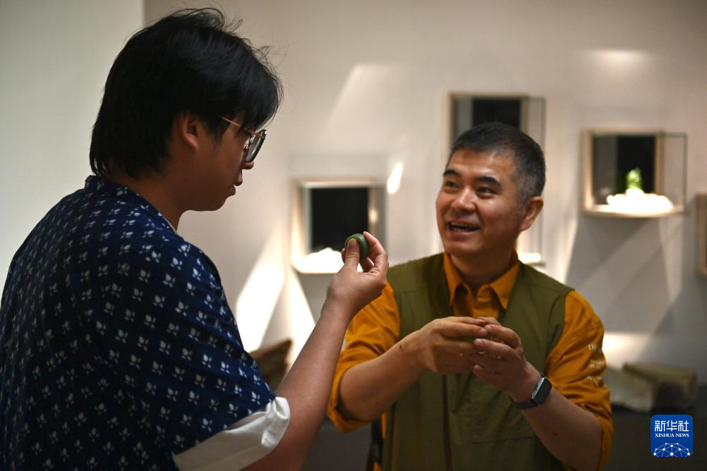 5月30日,唐校(左)在“玉三生”工作室內與玉雕師交流雕刻技藝。