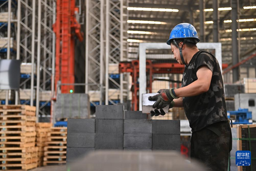 6月6日,工人在海城利爾麥格西塔材料有限公司搬運鋼包鎂碳磚。