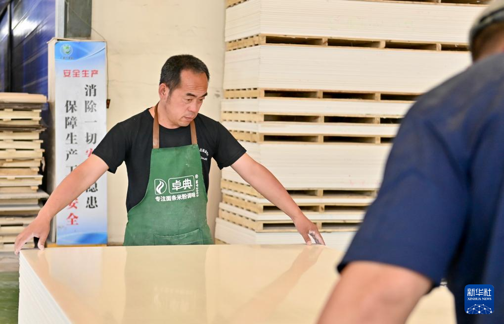 6月6日,工人在海城市大德廣消防門業材料有限公司搬運菱鎂防火門芯板。