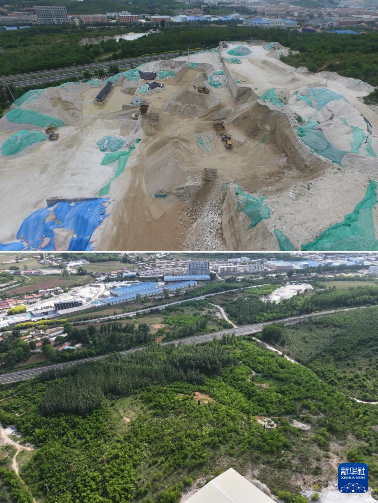 拼版照片:上圖為2019年8月6日拍攝的遼寧省海城市一處菱鎂礦開采現場(無人機照片,新華社發);下圖為6月6日拍攝的同一位置經過整改復綠的菱鎂礦(無人機照片,新華社記者 吳青昊 攝)。