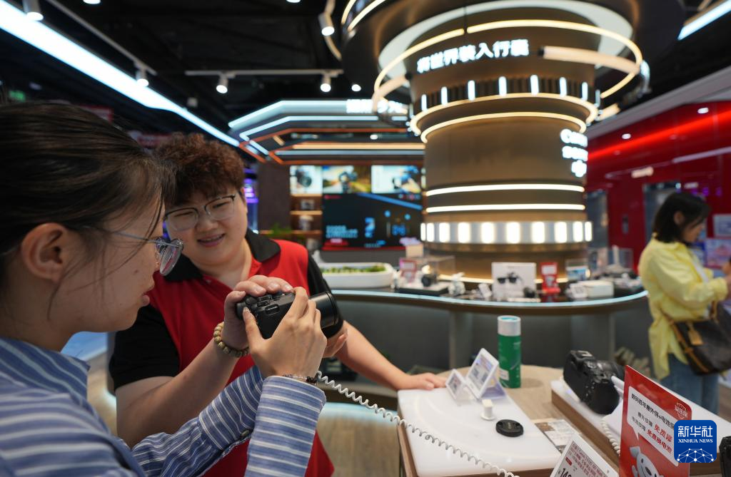 大連天津街京東MALL商場的攝影攝像銷售專員姜小姐(左二)向顧客推薦照相機(6月13日攝)。