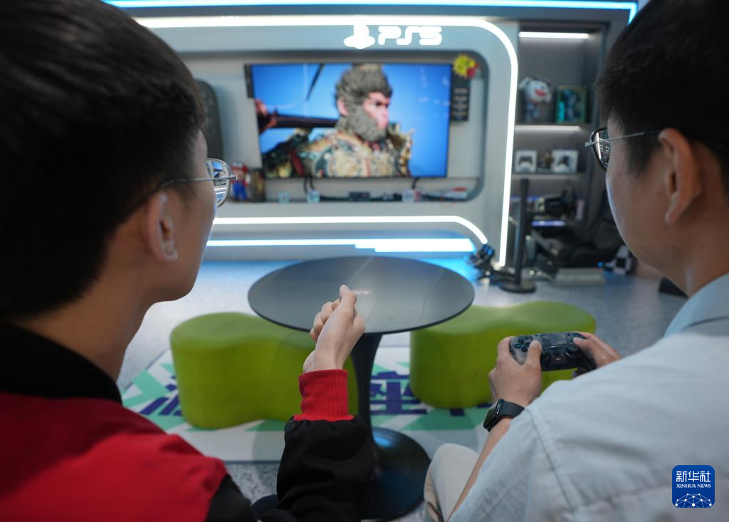 大連天津街京東MALL商場的游戲體驗官(左)陪著顧客操控游戲角色(6月13日攝)。