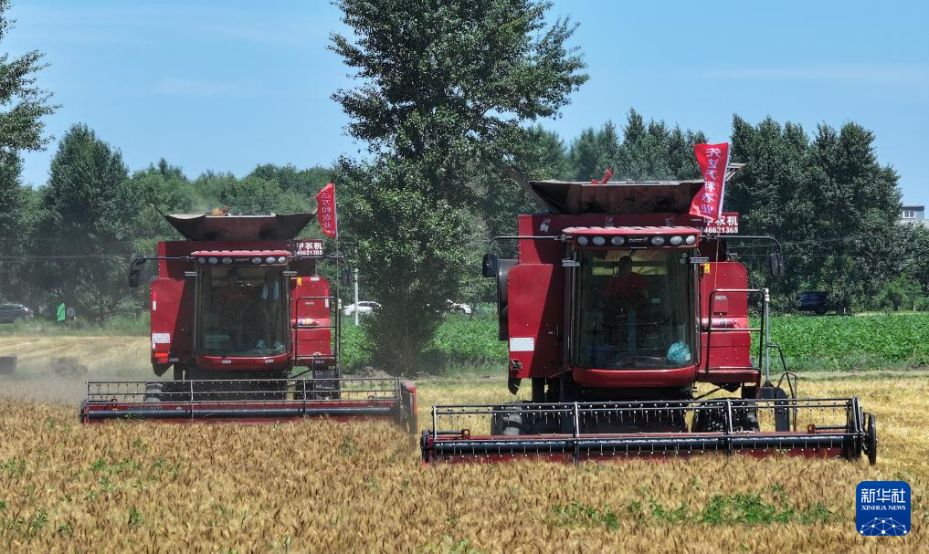 7月7日,在遼寧省阜新市彰武縣,收割機在收獲小麥(無人機照片)。