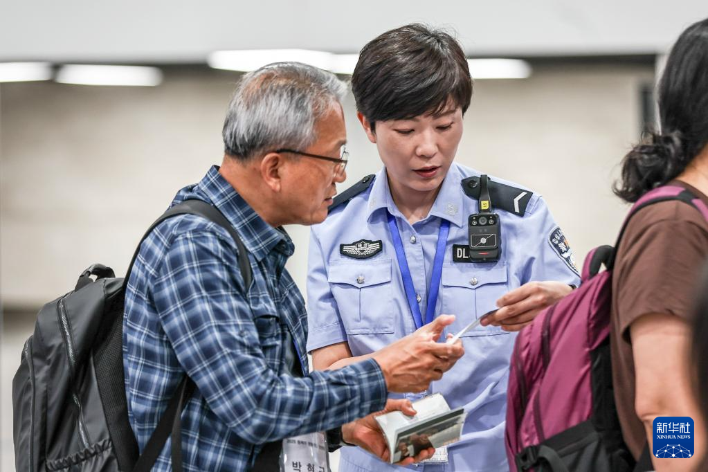 7月9日,大連周水子出入境邊防檢查站輔警解答韓國旅客咨詢的問題。