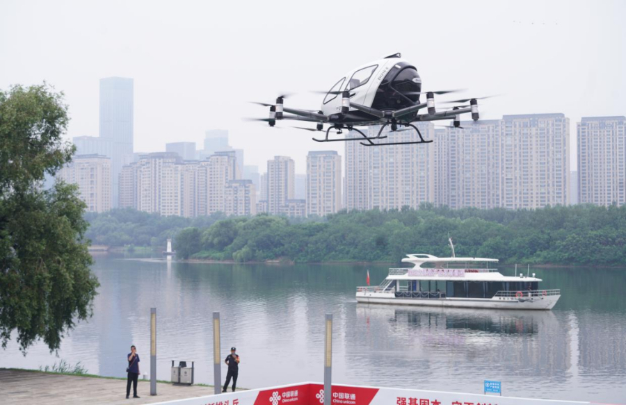 7月28日,在沈陽渾南奧林匹克公園3號碼頭西廣場,沈陽渾河廊道eVTOL低空觀光旅游項目成功完成驗證性試驗飛行。