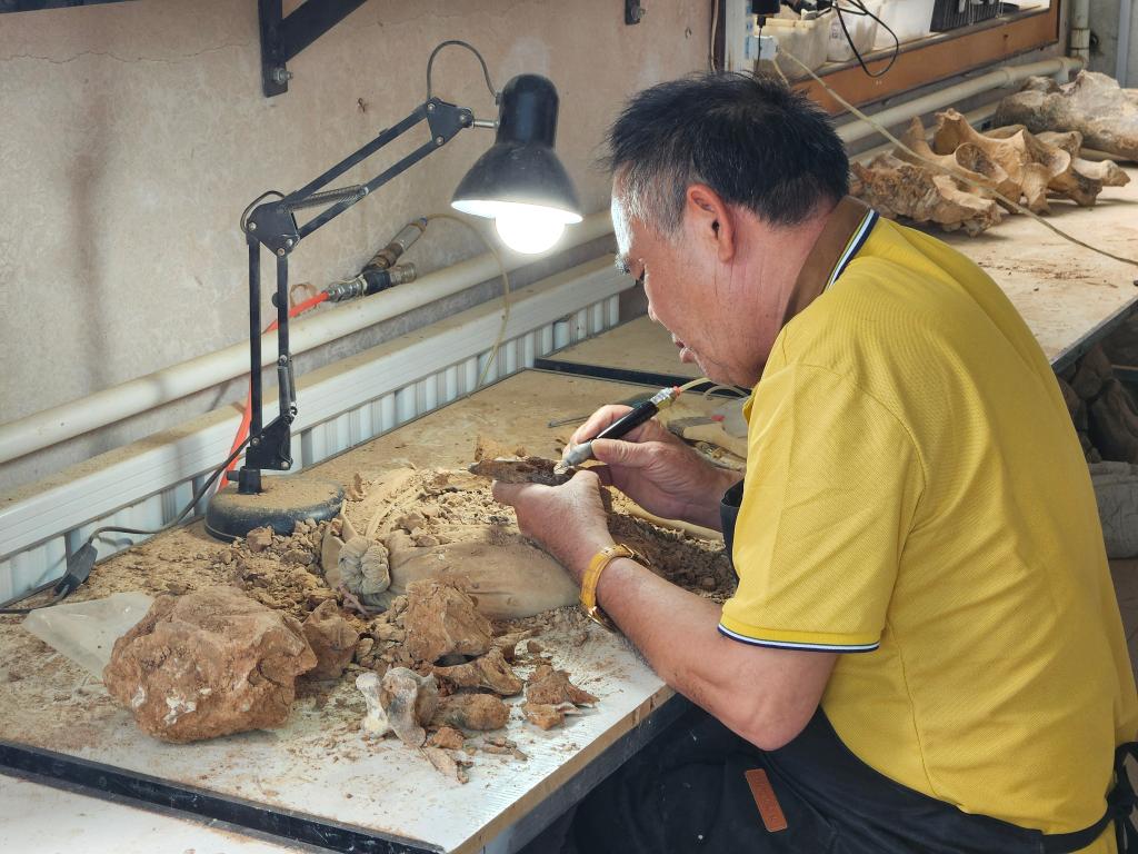 “出土的化石被大量泥土包裹,需要仔細清理和修復?!敝袊茖W院古脊椎動物與古人類研究所駱駝山研究項目組技師劉虎介紹說,小心翼翼地清理后,他們還要對化石脆弱的部分進行加固和修復。