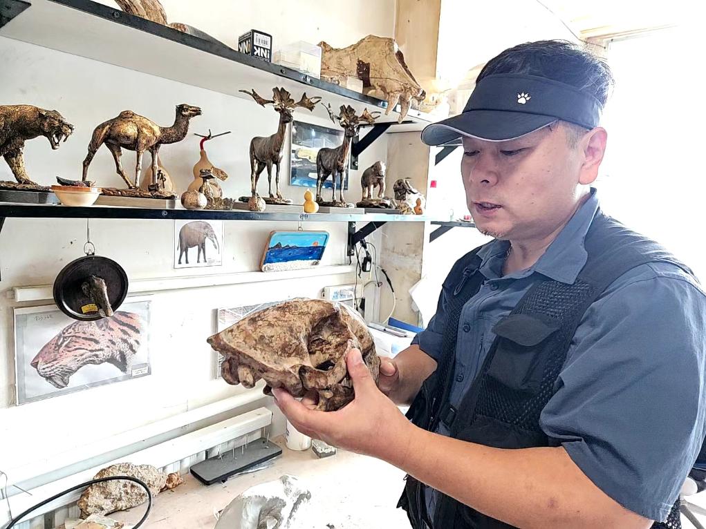 新華社沈陽8月31日電(記者于也童、張博群)走進位于大連市金普新區復州灣街道的一處工作室,一副高3.4米、寬1.5米、長4.5米的金普巨副駱駝骨架標本引人注目。身高1.76米的記者在它身下抬起頭,只能看到這只巨獸的下頜骨。龐大的體型、微黃的骨骼,讓它看起來與工作室內的現代文明有些“格格不入”。