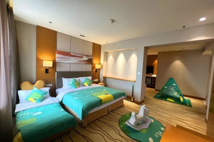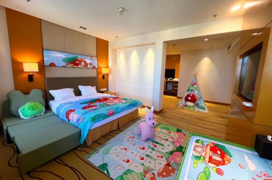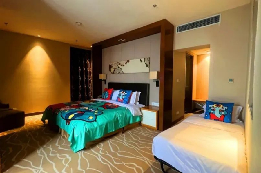 假日酒店親子房,像把五彩繽紛的世界呈現在眼前,身在其中仿佛進入到心中幻想的童話世界。無論從墻壁、床、衛生間到抱枕,都經過了精心的設計,配上憨態可掬的公仔玩具,讓小朋友愛不釋手。