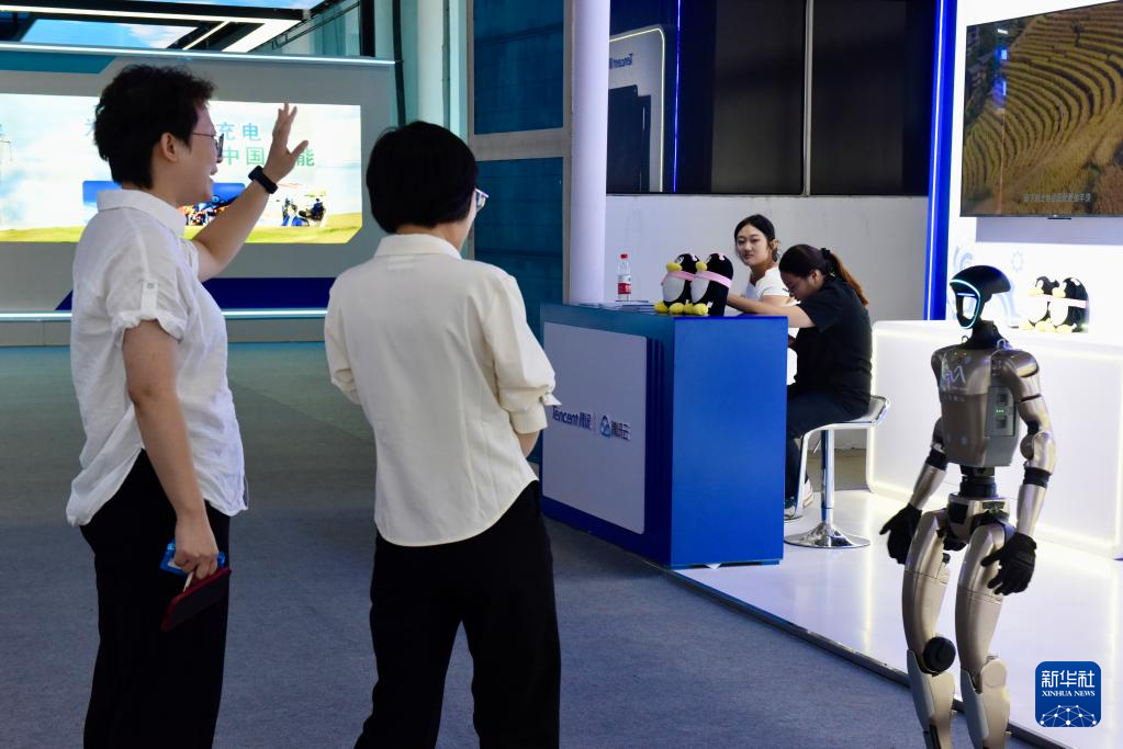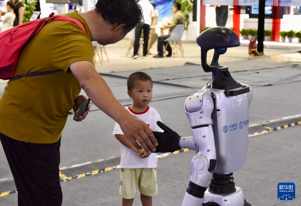 9月7日,觀眾與中國移動靈犀機器人互動。