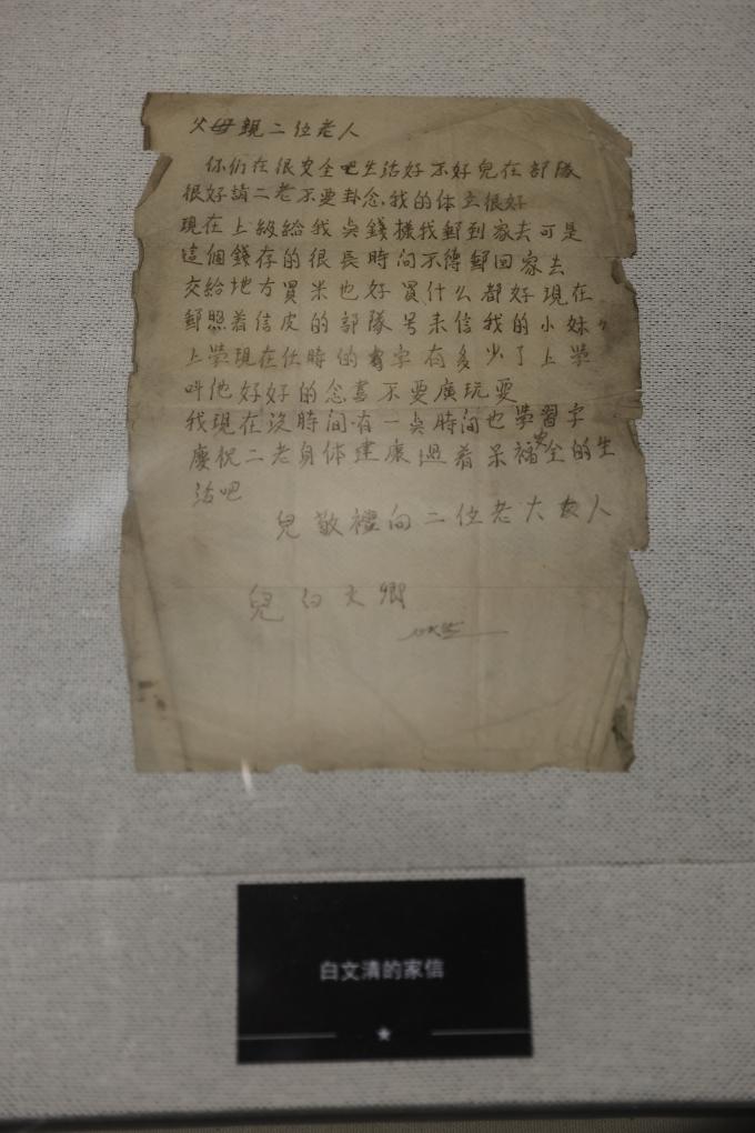 這是沈陽抗美援朝烈士陵園紀念館內展出的志愿軍戰士白文清的家書(2025年9月10日攝)。 新華社記者 潘昱龍 攝