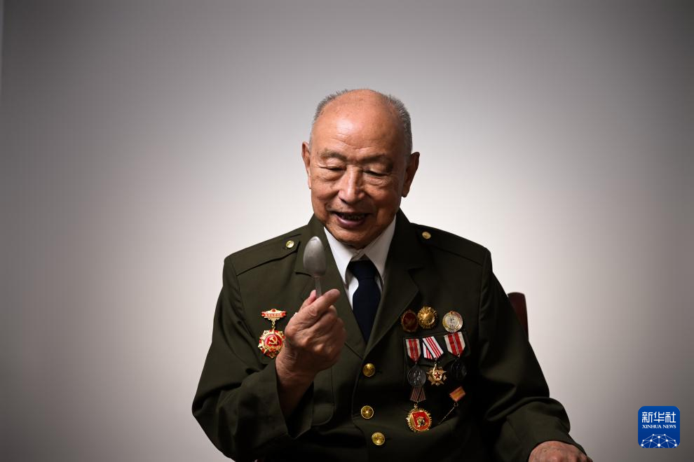 拍攝于2024年7月的照片顯示志愿軍老戰士曾國興手持戰友贈送的勺子。新華社記者 楊青 攝