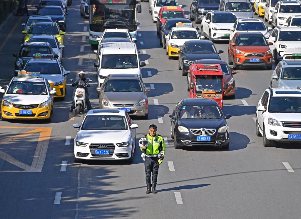 9月18日,交警在沈陽崇山中路脫帽佇立。新華社記者 周華 攝