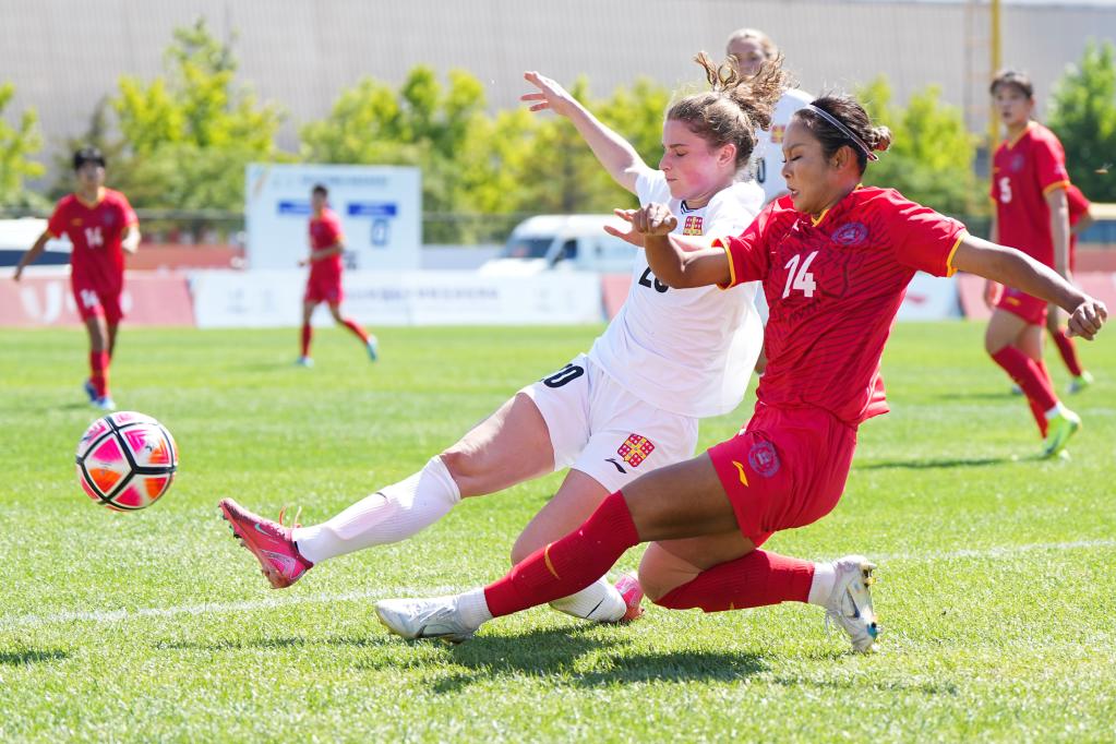 9月18日,北京師范大學女足球員馬玉琳(右)與拉瓦爾大學女足球員梅洛迪拼搶。新華社記者 鄭煥松 攝