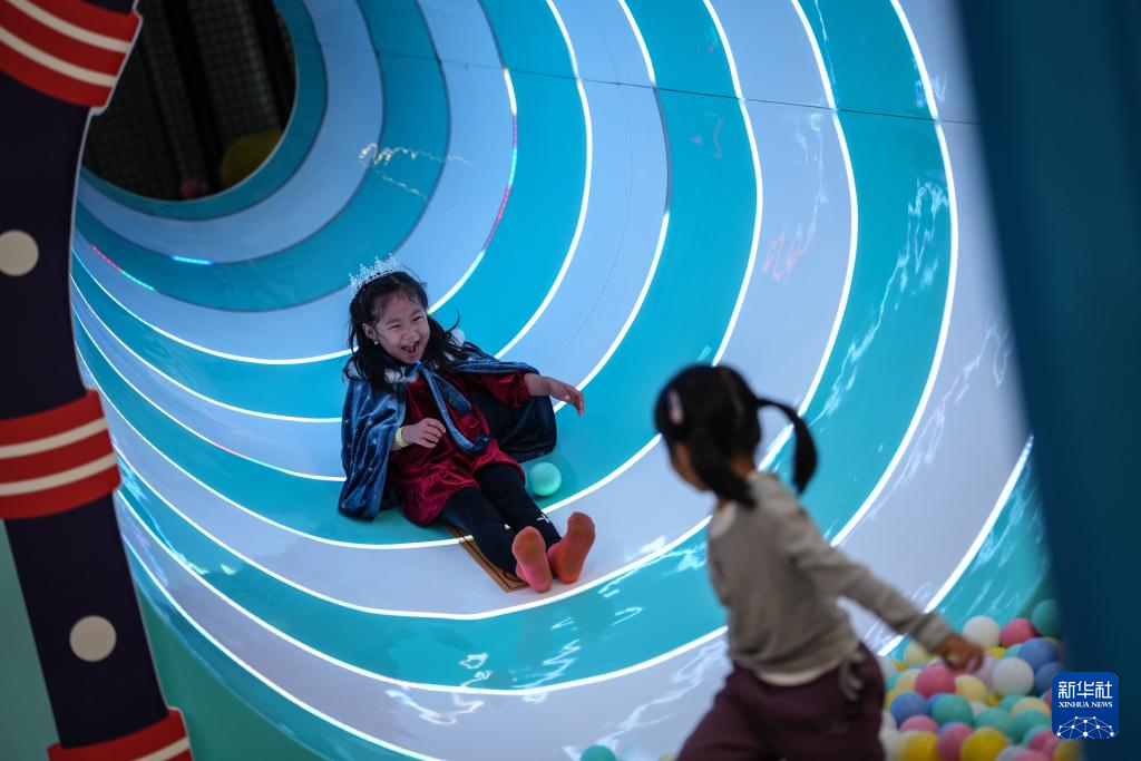 10月8日,小朋友在沈陽糧倉文化產業創意園內的“快樂專+”游樂場體驗游樂項目。