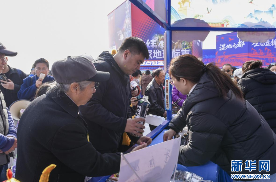 圖為錦州展位上,游客排隊品嘗凍梨汁。新華網發